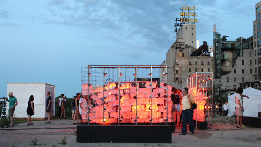 Winner of the Art & Interaction category at SXSWeco's Place By Design competition (2016). Phase Change creatively re-presents the effects of climate change through an engaging and dynamic spatial construction of melting ice. The ephemeral installation consists of 12,000 pounds of ice harvested from Lake Bde Maka Ska in March 2016 and stored passively from March through June. This sculptural ice form faces a lattice of infra-red lamps that are programmed to fluctuate based on data derived from climate change research.